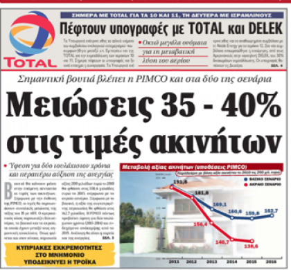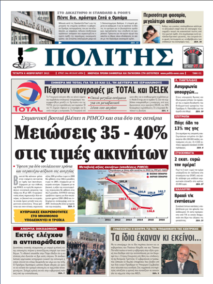 Και ο Πολίτης με τίτλο Μειώσεις 35-40% στις τιμές ακινήτων αναφέρεται στην σημαντική βουτιά για τα ακίνητα που βλέπει η PIMCO, αλλού η εφημερίδα γράφει για τις υπογραφές με TOTAL και DELEK όπως και για τα οκτώ μεγάλα ονόματα που αναφέρονται για την μεταβατική λύση του αερίου.
