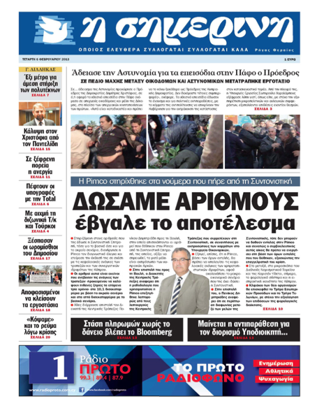 Η «Σημερινή», με πρωτοσέλιδο τίτλο «Δώσαμε αριθμούς, έβγαλε το αποτέλεσμα», γράφει ότι η PIMCO διενήργησε τον διαγνωστικό έλεγχο στηριζόμενη στους αριθμούς που πήρε από την Συντονιστική Επιτροπή, προσθέτοντας ότι οι αριθμοί αυτοί είναι εκείνοι που ανέβασαν τις ανάγκες των τραπεζών στα 10.1 δις με βάση το ακραίο σενάριο και στα 7 δις με το βασικό σενάριο. Ακόμη γράφει ότι ο Πρόεδρος της Δημοκρατίας άδειασε την Αστυνομία για τα επεισόδια στην Πάφο ανάμεσα σε απεργούς οικοδόμους και μέλη της Δύναμης. Επίσης, αναφέρει ότι το Bloomberg βλέπει στάση πληρωμών χωρίς το δάνειο.