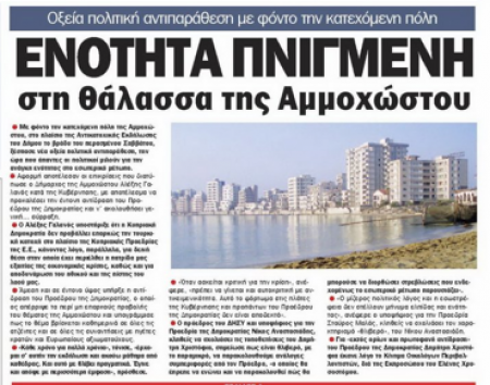 «Η Σημερινή», με κύριο τίτλο «Ενότητα πνιγμένη στη θάλασσα της Αμμοχώστου«, γράφει ότι με φόντο την κατεχόμενη πόλη της Αμμοχώστου, στο πλαίσιο της αντικατοχικής εκδήλωσης του Δήμου το βράδυ του περασμένου Σαββάτου, ξέσπασε νέα οξεία πολιτική αντιπαράθεση, την ώρα που άπαντες οι πολιτικοί μιλούν για την ανάγκη ενότητας στο εσωτερικό μέτωπο. Σε άλλο θέμα αναφέρεται σε δηλώσεις του Αρχιεπισκόπου Χρυσοστόμου, πως «αν ζούσε ο Μακάριος θα απέρριπτε τη διζωνική». Αλλού γράφει ότι Ελλάδα-Ισραήλ θωρακίζουν την κυπριακή ΑΟΖ, σημειώνοντας ότι από τούδε και στη εξής συνεχής θα είναι η παρουσία ελληνικών και ισραηλινών πολεμικών πλοίων περιμετρικά της κυπριακής ΑΟΖ.