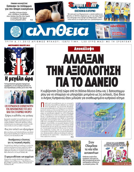 Η «Αλήθεια», υπό τον τίτλο «Άλλαξαν την αξιολόγηση για το δάνειο», γράφει ότι πηγές από την Κυβέρνηση και το Υπουργείο Εμπορείου διασυνδέουν αλλαγές που έγιναν στην αξιολόγηση των προσφορών για τον β’ γύρο αδειοδότησης στα οικόπεδα της ΑΟΖ με ένα ρωσικό δάνειο. Προσθέτει επίσης ότι η Κυβέρνηση ζητά τώρα από τη Μόσχα δάνειο έστω και ένα δις ευρώ για να αποφύγει την υπογραφή μνημονίου ως τις εκλογές και συμπληρώνει ότι ο ΓΓ του ΑΚΕΛ είχε δίκαιο όταν μιλούσε για αναθεωρημένο κυπριακό αίτημα. Αλλού, αναφέρεται στις αμερικανικές εκλογές, γράφοντας ότι οι δημοσκοπήσεις παραμένουν αμφίρροπες, αν και ο Ομπάμα φαίνεται να έχει περισσότερες ελπίδες για νίκη. Επίσης γράφει για δυο προτάσεις από Λαϊκή και Τράπεζα Κύπρου που δημιουργούνε ελπίδες για επίλυση του θέματος των αξιογράφων.