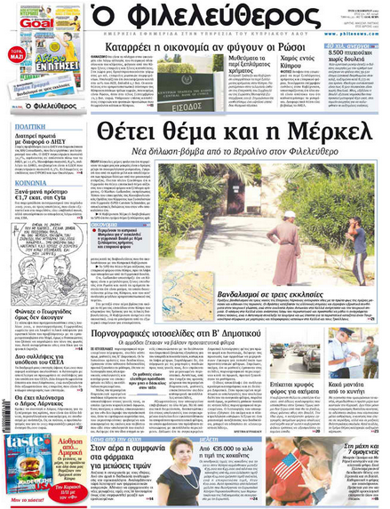 Ο «Φιλελεύθερος» με τίτλο «Θέτει θέμα και η Μέρκελ» γράφει για νέα δήλωση-βόμβα από το Βερολίνο και προσθέτει ότι η Γερμανία θα θέσει επιτακτικά το θέμα αύξησης εταιρικού φόρου και ξέπλυμα χρήματος. Παραθέτει δηλώσεις του Εκπροσώπου Τύπου των Γερμανών Σοσιαλιστών (SPD), που λέει ότι η Κυβέρνηση Μέρκελ τους διαβεβαίωσε ότι θα εγείρει το θέμα του ξεπλύματος χρήματος κατά τις διαβουλεύσεις με την Κυβέρνηση, ενώ το ίδιο το SPD θα θέσει θέμα εταιρικού φόρου στη γερμανική Βουλή. Αλλού, η εφημερίδα γράφει ότι μαθητές β’ Δημοτικού σέρφαραν σε ιστοσελίδες πορνογραφικού περιεχομένου, καθώς οι αρμόδιοι ξέχασαν να βάλουν προστατευτικά φίλτρα. Επίσης, γράφει ότι η συμφωνία για μειώσεις τιμών στα φάρμακα είναι στον αέρα.