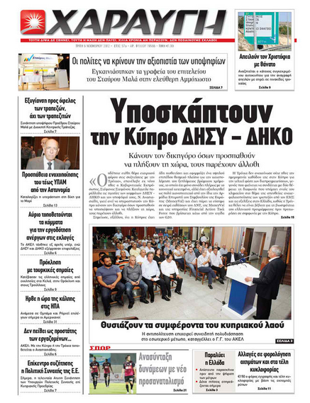 Η «Χαραυγή», με τίτλο «Υποσκάπτουν την Κύπρο ΔΗΣΥ-ΔΗΚΟ» γράφει ότι ουδέποτε ετέθη θέμα εταιρικού φόρου στις συζητήσεις με την Τρόικα, όπως επανέλαβε τη Δευτέρα ο Κυβερνητικός Εκπρόσωπος Στέφανος Στεφάνου, καταγγέλλοντας παράλληλα τις ηγεσίες ΔΗΣΥ και ΔΗΚΟ ότι κάνουν το δικηγόρο όσων προσπαθούν να υποσκάψουν και να πλήξουν τη χώρα. Αλλού, γράφει ότι ο ΓΓ του ΑΚΕΛ Άντρος Κυπριακού καταγγέλλει πως η αντιπολίτευση επιχειρεί συνειδητή πολυδιάσπαση στο εσωτερικό μέτωπο. Επίσης, αναφέρει ότι νομοσχέδιο της Κυβέρνησης προτείνει 150 ευρώ φόρο εγγραφής και τέλη κυκλοφορίας με βάση τις εκπομπές ρύπων.