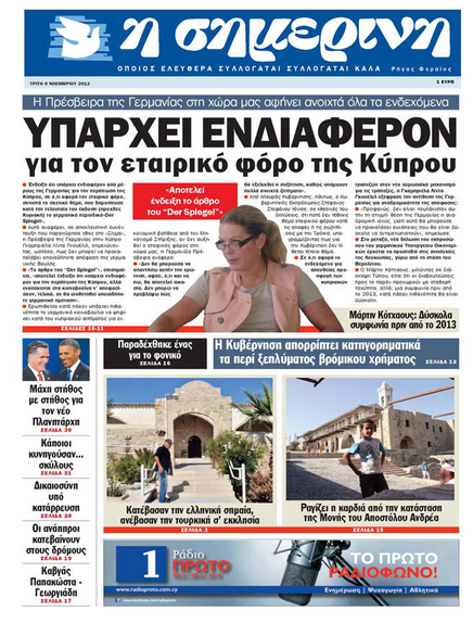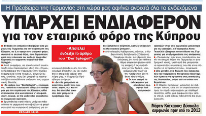 «Υπάρχει ενδιαφέρον για τον εταιρικό φόρο της Κύπρου» τιτλοφορείται το πρωτοσέλιδο θέμα της «Σημερινής», η οποία φιλοξενεί συνέντευξη της Πρέσβειρας της Γερμανίας στην Κύπρο που λέει ότι το άρθρο του περιοδικού Spiegel αποτελεί ένδειξη ότι υπάρχει ενδιαφέρον για την περίπτωση της Κύπρου, αλλά εναπόκειται στα κοινοβούλια να αποφασίσουν αν θα υιοθετηθεί οποιαδήποτε γερμανική πρόταση. Επίσης αναφέρεται στο περιστατικό αφαίρεσης της ελληνικής σημαίας, στην εκκλησία του Αγ. Αντωνίου στα Κελλιά Λάρνακας και στην αντικατάστασή της με την τουρκική. Αλλού, η εφημερίδα φιλοξενεί οδοιπορικό του ΚΥΠΕ στη Μονή του Αποστόλου Ανδρέα, η οποία έχει αφεθεί στο έλεος της εγκατάλειψης.