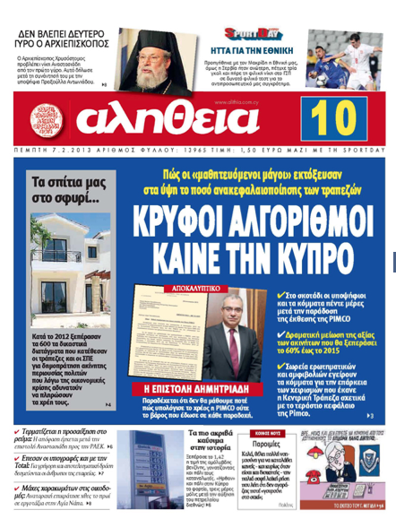 Η «Αλήθεια», υπό τον τίτλο «Κρυφοί αλγόριθμοι καίνε την Κύπρο», γράφει ότι σωρεία ερωτηματικών και αμφιβολιών εγείρονται για την επάρκεια των χειρισμών που έκανε η Κεντρική Τράπεζα σχετικά με το τεράστιο κεφάλαιο της PIMCO και προσθέτει ότι σε επιστολή του, ο Διοικητής της Κεντρικής Τράπεζας παραδέχεται ότι δεν θα μάθουμε ποτέ πώς υπολόγισε το χρέος η PIMCO. Αλλού γράφει ότι κατά το 2012 ξεπέρασαν τα 600 τα δικαστικά διατάγματα που κατέθεσαν οι τράπεζες και οι ΣΠΕ για δημοπράτηση ακίνητης περιουσίας πολιτών που δεν μπορούν να πληρώσουν τα χρέη τους. Επίσης, η «Α» αναφέρεται στις χθεσινές δηλώσεις του Αρχιεπισκόπου, ο οποίος πρόβλεψε νίκη του Νίκου Αναστασιάδη από τον πρώτο γύρο.