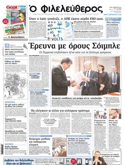 «Ο Φιλελεύθερος», στο κύριο του θέμα με τίτλο «Έρευνα με όρους Σόιμπλε», γράφει ότι από το μικροσκόπιο ανεξάρτητου οίκου θα περάσει η Κύπρος για το ξέπλυμα χρήματος όπως αποκάλυψε χθες στις Βρυξέλλες Ευρωπαίος αξιωματούχος και προσθέτει ότι ο γερμανικός άξονας επιβάλλει την έρευνα όπως θέλει. Σε άλλο της θέμα η εφημερίδα αναφέρει ότι η ΑΗΚ έκανε κέρδη 80 εκ. ευρώ σε μια περίοδο που οι πολίτες υπέφεραν από τους φουσκωμένους λογαριασμούς και ενώ η κατανάλωση ενέργειας μειώθηκε. Επίσης ο «Φ» γράφει ότι στα 1,8 εκατ. έφθασαν οι εισπράξεις από τα απλήρωτα πρόστιμα ένα μήνα μετά τις ρυθμίσεις της Αστυνομίας στα αεροδρόμια.