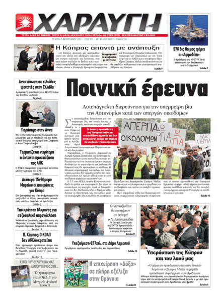 Η «Χαραυγή», υπό τον τίτλο «Ποινική έρευνα», γράφει ότι σε αυτεπάγγελτη διερεύνηση για την υπέρμετρη βία την οποία άσκησε η Αστυνομία κατά των απεργών οικοδόμων στην Πάφο με το διορισμό ποινικών ανακριτών προχωρεί η Ανεξάρτητη Αρχή Διερεύνησης Ισχυρισμών και Παραπόνων κατά της Αστυνομίας. Σε άλλο της θέμα η εφημερίδα γράφει ότι σύμφωνα με τον Πρόεδρο της ΚΡΕΤΥΚ, Χαράλαμπο Έλληνα, μόνο η ποσότητα που έχει κατ’ αρχήν ανακαλυφθεί στο τεμάχιο «Αφροδίτη» αντιστοιχεί σε εισόδημα 70 δις δολαρίων και ζήτησε επίσπευση των διαδικασιών για το Τερματικό. Επίσης, η «Χ» αναφέρει ότι αναστάτωση επικρατεί ανάμεσα σε χιλιάδες φοιτητές στην Ελλάδα λόγω αλλαγών που επιφέρει το σχέδιο «Αθηνά».