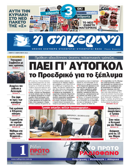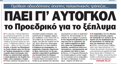 Η «Σημερινή», με κύριο τίτλο «Πάει γι’ αυτογκόλ το Προεδρικό για το ξέπλυμα», γράφει ότι την ώρα που η Κύπρος κάνει εκστρατεία να πείσει ότι δεν αποτελεί σταθμό ξεπλύματος, η Κυβέρνηση ανοίγει νέες φάλιες με αιτία την κίνηση του Προεδρικού να δώσει οδηγίες προς την Κεντρική Τράπεζα για άδεια λειτουργίας στην Κύπρο μιας παλαιστινιακής τράπεζας που βρίσκεται στη Λωρίδα της Γάζας και ότι τέτοιες τράπεζες θεωρούνται πλυντήρια μαύρου χρήματος. Αλλού, γράφει για την υπογραφή των συμβολαίων με τη γαλλική TOTAL για τα οικόπεδα 10 και 11 της ΑΟΖ. Επίσης, αναφέρει ότι οι τιμές των καυσίμων είναι στα ύψη.