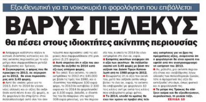 Η εβδομαδιαία αγγλόφωνη «The Cyprus Weekly” γράφει στο κύριο της θέμα, με τίτλο «Κατακλυσμός φόρων», αναφέρεται στη χθεσινή ψήφιση από τη Βουλή νομοσχεδίων για αυξήσεις στις τιμές των τσιγάρων, των καπνικών προϊόντων και του αλκοόλ καθώς και για αύξηση του ΦΠΑ. Αλλού αναφέρεται στις αλλαγές που θα επέλθουν στη δημόσια υπηρεσία λόγω Μνημονίου. Εξάλλου αναφέρεται στην άφιξη στην Κύπρο της φλόγας του Μαραθώνα και τη μεταφορά της από λαμπαδηδρόμους στην Πύλη Αμμοχώστου στο πλαίσιο του 3ου Διεθνούς Μαραθωνίου Λευκωσίας που θα πραγματοποιηθεί την Κυριακή.