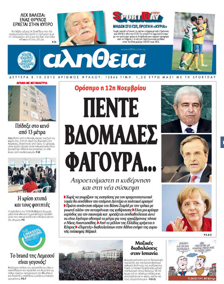 Η «Αλήθεια», με τίτλο «Πέντε εβδομάδες φαγούρα», αναφέρεται στην οικονομία και γράφει ότι πρώτη φορά συναντάται σήμερα ο ΥΠΟΙΚ με την Τρόικα και πως ορόσημο είναι η 12η Νοεμβρίου. Σε άλλο θέμα γράφει για γυναίκα από το Νεπάλ που έχασε τη ζωή της όταν στην προσπάθεια να αποφύγει σύλληψή της από την Αστυνομία έπεσε από ύψος 13 μέτρων. Αλλού γράφει ότι η κρίση χτυπά και τους φοιτητές, σύμφωνα με δηλώσεις του Προέδρου της ΠΟΦΕΝ στην εφημερίδα.