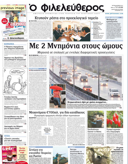 Ο «Φιλελεύθερος», με τίτλο «Με 2 μνημόνια στους ώμους», γράφει ότι ξαφνικά ο απλός πολίτης βρίσκεται ενώπιον των δύο πακέτων μέτρων, της Τρόικας και της κυβέρνησης, αλλά και για ενημέρωση των πολιτικών αρχηγών από το Διοικητή της Κεντρικής Τράπεζας για το χρηματοπιστωτικό τομέα. Αλλού γράφει ότι φούλαραν με κρατούμενους οι Κεντρικές Φυλακές, αφού έφτασαν τους 738 με χωρητικότητα τους 400. Σε άλλο θέμα αναφέρεται σε μηχανήματα παρακολούθησης, αξίας 700.000 ευρώ που θα χρησιμοποιηθούν μόνο σε δύο κατάδικους τελικά.