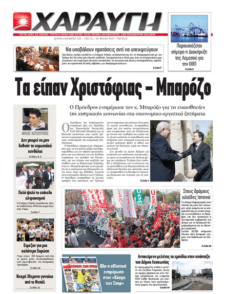 Η «Χαραυγή», με τίτλο «Τα είπαν Χριστόφιας – Μπαρόζο», αναφέρει ότι ο Πρόεδρος της Δημοκρατίας ενημέρωσε τον Πρόεδρο της Ευρωπαϊκής Επιτροπής για τις ευαισθησίες της κυπριακής κοινωνίας στα οικονομικο-εργατικά ζητήματα. Αλλού γράφει ότι χιλιάδες Ισπανοί βρίσκονται στους δρόμους και έπεται γενική απεργία το Νοέμβριο. Σε άλλο θέμα αναφέρεται στους 300 περίπου δρομείς που ανταποκρίθηκαν στην πρωτοβουλία της Κυπριακής Προεδρίας και έτρεξαν στις Βρυξέλλες για μια καλύτερη Ευρώπη, όπως είναι και το σύνθημα της Προεδρίας.