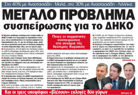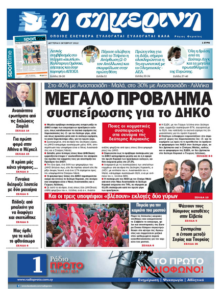 Η «Σημερινή», με τίτλο «Μεγάλο πρόβλημα συσπείρωσης για το ΔΗΚΟ», αναφέρεται στη δημοσκόπηση που αφορά το δεύτερο γύρο των Προεδρικών εκλογών και γράφει ότι τα ποσοστά συσπείρωσης του ΔΗΚΟ με Αναστασιάδη – Μαλά τη δεύτερη Κυριακή φτάνουν το 40% και με Αναστασιάδη – Λιλλήκα στο 30%. Σε άλλο θέμα αναφέρεται στην επίσκεψη για πρώτη φορά στην Αθήνα της Γερμανίδας Καγκελαρίου, Αγκελα Μέρκελ, ενώ αλλού γράφει για την πορεία για τον καρκίνο του μαστού που πραγματοποίησαν το απόγευμα της Κυριακής στη Λευκωσία φίλοι και υποστηρικτές της Europa Donna Κύπρου.