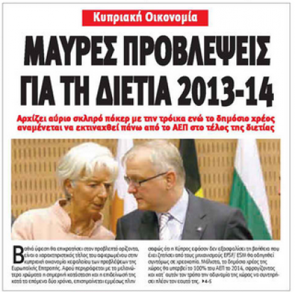 Η «Αλήθεια» με τίτλο «Μαύρες προβλέψεις για την διετία 2013-14» γράφει ότι αρχίζει αύριο σκληρό πόκερ με την Τρόικα ενώ το δημόσιο χρέος αναμένεται να εκτιναχθεί πάνω από το ΑΕΠ στο τέλος της διετίας. Αλλού γράφει για εκρηκτικό κλίμα μέσα και έξω από τη Βουλή των Ελλήνων κατά τη συζήτηση χθες των νέων μέτρων. Σε άλλο θέμα γράφει ότι ξετυλίγεται το νήμα των πλαστών τιμολογίων στον ΟΣΕΛ και ανακρίθηκε χθες ο Πρόεδρος του οργανισμού.