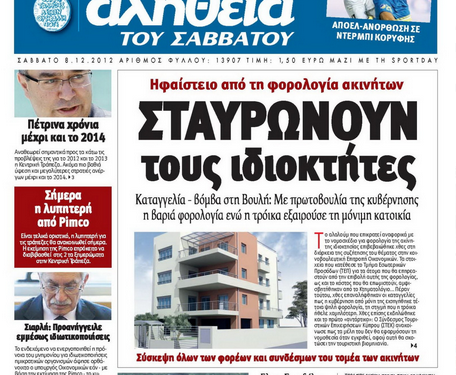 Η «Αλήθεια», υπό τον τίτλο “Σταυρώνουν τους ιδιοκτήτες» γράφει ότι το αλαλούμ που επικρατεί αναφορικά με το νομοσχέδιο για φορολογία της ακίνητης ιδιοκτησίας επιβεβαιώθηκε χθες στη διάρκεια της συζήτησης του θέματος στην κοινοβουλευτική Επιτροπή Οικονομικών. Αλλού γράφει ότι κατά τη χθεσινή ακροαματική διαδικασία ενώπιον του Κακουργιοδικείου Λευκωσίας, η Έλενα Σκορδέλη αρνήθηκε κατηγορηματικά όλες τις υποβολές της κατηγορούσας Αρχής, ότι τόσο η ίδια και ο αδελφός της είναι οι ηθικοί αυτουργοί στη δολοφονία του Άντη Χατζηκωστή. Γράφει, επίσης, ότι η Κεντρική Τράπεζα αναθεωρεί σημαντικά προς τα κάτω τις προβλέψεις της για το 2012 και το 2013.