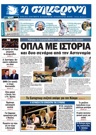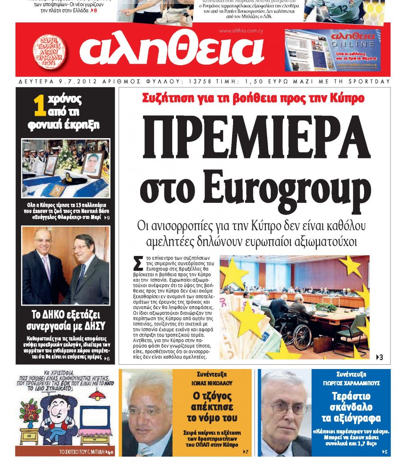 Η «Αλήθεια» στο κύριο της θέμα με τίτλο «Πρεμιέρα στο Eurogroup», γράφει ότι στο επίκεντρο των συζητήσεων της σημερινής συνεδρίασης του Eurogroup στις Βρυξέλλες θα βρίσκεται η βοήθεια προς την Κύπρο και την Ισπανία, με Ευρωπαίους αξιωματούχους να δηλώνουν ότι δεν θα ληφθούν στη σημερινή συνεδρίαση οριστικές αποφάσεις. Αλλού η εφημερίδα γράφει ότι καθοριστικές θα είναι οι επόμενες μέρες ιδιαίτερα στα κόμματα του ενδιάμεσου χώρου όσον αφορά τις τελικές αποφάσεις για τις προεδρικές εκλογές.