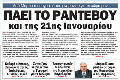 «Πάει το ραντεβού και της 21ης Ιανουαρίου» είναι ο τίτλος του κυρίου θέματος της «Σημερινής» η οποία αναφέρεται στις δηλώσεις του Ζιαν Κλόντ Γιούνκερ ότι δεν βλέπει ουσιαστική απόφαση για το κυπριακό μνημόνιο εντός του μήνα. Αλλού η εφημερίδα αναφέρεται στις δηλώσεις του ΥΠΟΙΚ για την βιωσιμότητα του κυπριακού χρέους και για το θέμα του ξεπλύματος βρώμικου χρήματος. Επίσης η «Σ» στο πρωτοσέλιδο της αναφέρεται σε υπόθεση λαθρεμπορίου τσιγάρων, η οποία κόστισε στο δημόσιο 2,5 εκ. δις και στην οποία εμπλέκονται τρεις τελωνειακοί λειτουργοί.