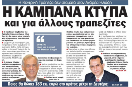 Η «Σημερινή» τιτλοφορεί το δημοσίευμά της υπό τον τίτλο « Η καμπάνα κτυπά και για άλλους τραπεζίτες» και γράφει ότι θα οδηγηθούν σε παραίτηση και άλλοι τραπεζικοί αξιωματούχοι συμπεριλαμβανομένου και του Μιχάλη Σαρρή, μετά την παραίτηση του διευθύνοντος συμβούλου της Τράπεζας Κύπρο Ανδρέα Ηλιάδη. Η εφημερίδα αναφέρεται στους λόγους που οδήγησαν σε παραίτηση τον κ. Ηλιάδη και στα ονόματα που ακούγονται ως διάδοχοί του. Η «Σ» επίσης πρωτοσέλιδα αναφέρεται στην συμπλήρωση ενός χρόνου από την τραγωδία στο Μαρί και γράφει ότι ο εφιάλτης για τις οικογένειες των θυμάτων συνεχίζεται. Αλλού, η εφημερίδα κάνει αναφορά στην επένδυση χιλιάδων πολιτών σε αξιόγραφα τραπεζών και στην συζήτηση χθες στη Βουλή για το θέμα.