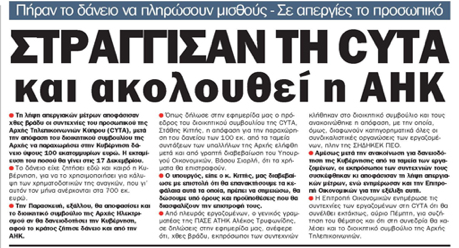 «Η Σημερινή» υπό τον τίτλο «Στράγγισαν τη CYTA και ακολουθεί η ΑΗΚ» γράφει ότι τη λήψη απεργιακών μέτρων αποφάσισαν χθες βράδυ οι συντεχνίες του προσωπικού της Αρχής Τηλεπικοινωνιών Κύπρου (CYTA), μετά την απόφαση του ΔΣ της Αρχής να παραχωρήσει στην Κυβέρνηση δάνειο ύψους 100 εκ. ευρώ. Σε άλλο θέμα αναφέρεται σε κινητοποιήσεις διαφόρων τάξεων του λαού που κατεβαίνουν οργανωμένα για να διαμαρτυρηθούν για τα μέτρα του μνημονίου. Αλλού, αναφέρεται σε καταθέσεις εκατομμυρίων από Κυπρίους στην Ελβετία.