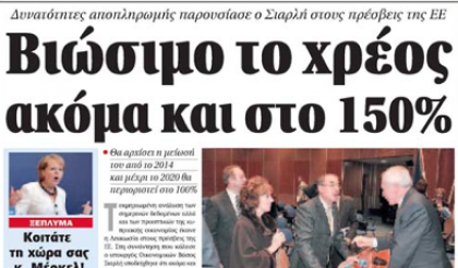 Η εβδομαδιαία «Καθημερινή της Κυριακής», υπό τον τίτλο «Ετοιμάζεται φόρμουλα διάσωσης του χρέους», γράφει ότι, ενώ η Κύπρος δέχεται πυρά από όλες τις πλευρές σχετικά με την τραπεζική διαφάνεια και τη βιωσιμότητα του χρέους, οι εμπλεκόμενοι επεξεργάζονται τη φόρμουλα που θα εξασφαλίσει πως οι ανάγκες χρηματοδότησης της Κύπρου θα είναι υποφερτές. Γράφει, επίσης, ότι στα ύψη εκτοξεύεται η δημοτικότητα της Άγκελα Μέρκελ, χάρη στην οποία οι Χριστιανοδημοκράτες αναμένεται να εξασφαλίσουν άνετη νίκη στις εκλογές του Σεπτεμβρίου. Επίσης, δημοσιεύει συνέντευξη του Κυβερνητικού Εκπροσώπου Στέφανου Στεφάνου, ο οποίος είπε ότι κανένας Πρόεδρος δεν θα μπορούσε να ασκήσει βέτο στην απομείωση του ελληνικού χρέους.