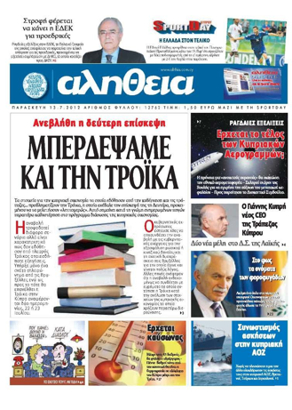 Η «Αλήθεια», στο κύριο της θέμα με τίτλο «Μπερδέψαμε και την Τρόϊκα», αναφέρει πως ανεβλήθη η δεύτερη επίσκεψη για να μελετήσει η ομάδα λεπτομερώς τα στοιχεία που τους δόθηκαν για την κυπριακή οικονομία. Αλλού γράφει ότι ο Γιάννης Κυπρή είναι ο νέος CEO της Τράπεζας Κύπρου. Σε άλλο θέμα γράφει ότι στο φως θα δίδονται τα ονόματα των φοροφυγάδων, μετά από απόφαση του Υπουργικού Συμβουλίου.