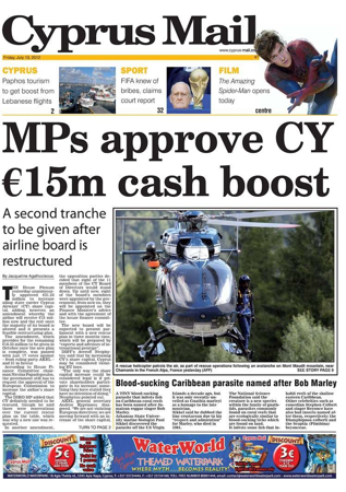 Η αγγλόγλωσση “Cyprus Mail”, με τίτλο «Οι Βουλευτές ενέκριναν χρηματική ώθηση 15 εκ στις ΚΑ», γράφει στο κύριο της θέμα πως η Βουλή θα δώσει τη δεύτερη δόση στον κρατικό αερομεταφορέα μετά την αναδιάρθρωση του ΔΣ. Αλλού γράφει ότι ο τουρισμός στην Πάφο θα βοηθηθεί από πτήσεις από το Λίβανο. Σε άλλο θέμα γράφει ότι ένα παράσιτο αίματος της Καραϊβικής έχει ονομαστεί «Μπομπ Μάρλεϊ».