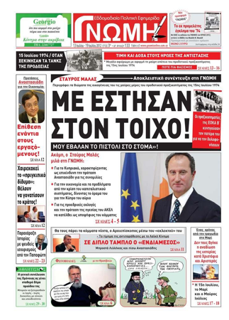 Η εβδομαδιαία εφημερίδα «Γνώμη» στο κύριο της θέμα με τίτλο «Με έστησαν στον τοίχο!» φιλοξενεί αποκλειστική συνέντευξη του Υπουργού, ο οποίος περιγράφει τα βιώματα της οικογένειάς του κατά το πραξικόπημα και μιλά για το Κυπριακό, την οικονομία και τις Προεδρικές εκλογές. Θα τους πάρει τα κόμματα νύχτα ο Αρχιεπίσκοπος μέσω του εκλεκτού του, γράφει αλλού η εφημερίδα, αναφερόμενη στον Γιώργο Λιλλήκα. Σε άλλο θέμα χαρακτηρίζει επίθεση ενάντια στους εργαζόμενους τις προτάσεις Αναστασιάδη για την οικονομία.