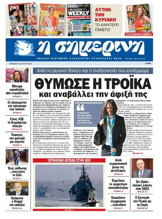 «Η Σημερινή», με κύριο τίτλο «Θύμωσε η Τρόϊκα», αναφέρει πως ανέβαλε την άφιξή της με αιτία το ρωσικό δάνειο και την αναξιοπιστία που εκπέμψαμε. Αλλού γράφει για ισραηλινή ασπίδα στην ΑΟΖ και πως καταγγέλθηκε η τουρκική πρόκληση στην αεροναυτική άσκηση που η Αγκυρα διεξάγει νοτίως της Κύπρου. Σε άλλο θέμα αναφέρεται σε λύση του περιουσιακού μέσω της ανταλλαγής και φιλοξενεί συνέντευξη του «προέδρου» της «επιτροπής αποζημιώσεων».