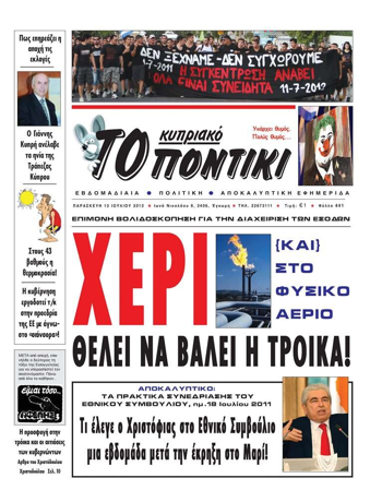 Η εβδομαδιαία εφημερίδα «Το ποντίκι» στο κύριο της θέμα με τίτλο «Χέρι και στο φυσικό αέριο θέλει να βάλει η Τρόϊκα» κάνει λόγο για επίμονη βολιδοσκόπηση για τη διαχείριση των εσόδων από το φυσικό αέριο. Αλλού δημοσιεύει έγγραφα από τη συνεδρία του Εθνικού Συμβουλίου μια βδομάδα μετά την έκρηξη στο Μαρί. Σε άλλο θέμα γράφει ότι είμαστε η δεύτερη χώρα στην ΕΕ μετά το Λουξεμβούργο με τους περισσότερους αλλοδαπούς.