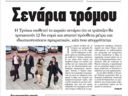 Η εφημερίδα «Χαραυγή» με τίτλο «Σενάρια τρόμου» γράφει ότι η Τρόικα υιοθετεί το ακραίο σενάριο ότι οι τράπεζες θα χρειαστούν 12 δις ευρώ και απαιτεί πρόσθετα μέτρα και ιδιωτικοποιήσεις Ημικρατικών, κάτι που απορρίπτεται, όπως αναφέρει. Αλλού γράφει για διακριτικές έρευνες όσον αφορά την λίστα της HSBC για άτομα που διατηρούν λογαριασμούς στο νησί Τζέρσει, ανάμεσα στους οποίους βρίσκονται και Ε/κ. Σε άλλο θέμα γράφει ότι αύριο θα πραγματοποιηθεί πανευρωπαϊκή κινητοποίηση συνδικάτων.