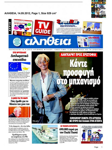 Η «Αλήθεια», υπό τον τίτλο «Τα…σπασμένα του Δ. Χριστόφια», γράφει ότι παραμονή της συνόδου του Eurogroup και της άφιξης στην Κύπρο των μεγάλων αφεντικών της τρόικας, το κυβερνητικό στρατόπεδο προχώρησε σε διαρροή του προσχεδίου με τα σκληρά μέτρα που αξιώνει η τρόικα να περιληφθούν στο κυπριακό μνημόνιο. Σε άλλο θέμα γράφει ότι «καρκινοβατεί» το ρωσικό δάνειο και ότι η Μόσχα αναμένεται να αποφασίσει για τη δυνατότητα δανειοδότησης της Κύπρου σε ένα μήνα. Αλλού γράφει ότι νεκρός ο πρεσβευτής των ΗΠΑ στη Λιβύη με αφορμή ταινία που σατιρίζει τον Μωάμεθ.