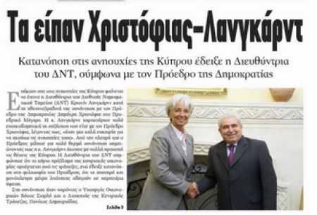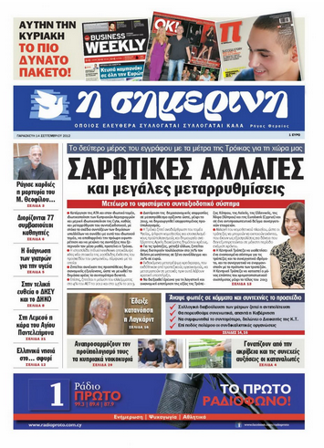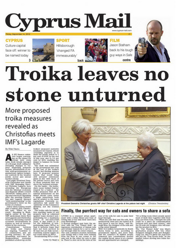 «Η Σημερινή», με κύριο τίτλο «Φωτιά τα μέτρα στο πακέτο της τρόικας», γράφει ότι μέτρα-φωτιά για όλα τα κοινωνικά στρώματα και ομάδες του πληθυσμού περιέχονται στο προσχέδιο μνημονίου, το οποίο επέδωσε στην Κυβέρνηση, η τρόικα. Περιέχονται προτάσεις για κατάργηση της ΑΤΑ και του 13ου μισθού. Αλλού γράφει ότι θα συναντηθεί με την Κριστίν Λαγκάρντ ο Πρόεδρος Χριστόφιας, ο οποίος δήλωσε ότι δεν προτίθεται να δεχθεί μνημόνιο που να οδηγεί στην πτώχευση. Σε άλλο θέμα αναφέρεται στην ομιλία Μπαρόζο χθες ενώπιον της Ολομέλειας του Ευρωπαϊκού Κοινοβουλίου ότι η επιλογή για την Ευρώπη είναι η ομοσπονδοποίηση των εθνών κρατών της.