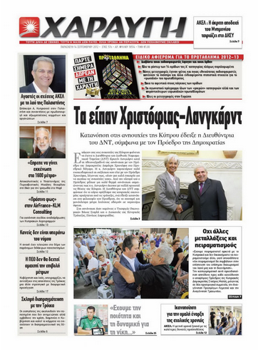 Η «Χαραυγή» τιτλοφορεί το κύριο της θέμα «Στρατηγικό σχέδιο για την οικονομία» και γράφει ότι σύμφωνα με δηλώσεις του Προέδρου Χριστόφια που θα συναντηθεί με την Λανγκάρτ, αυτό θα συζητηθεί με κόμματα και κοινωνικούς εταίρους προτού τεθεί στην τρόικα. Σε άλλο θέμα γράφει ότι λείψανα από στρατιωτικές «ζώνες» στα κατεχόμενα εντοπίστηκαν σε ανασκαφές που πραγματοποιήθηκαν από τη ΔΕΑ. Αλλού αναφέρει ότι σειρά συμφωνιών υπογράφουν Κύπρος-Noble για την έλευση του φυσικού αερίου στην Κύπρο και για την κατασκευή τερματικού.