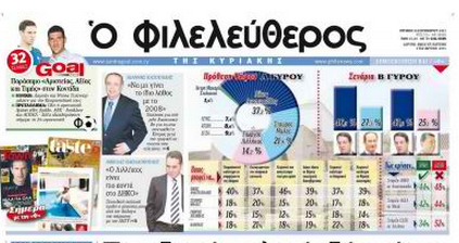 Στο κύριό του θέμα με τίτλο «Προεδρικές εκλογές δύο γύρων», ο «Φιλελεύθερος» δημοσιεύει τα αποτελέσματα δημοσκόπησης που διενεργήθηκε για λογαριασμό της εφημερίδας, σύμφωνα με τα οποία στις προεδρικές εκλογές του Φεβρουαρίου του 2013 θα διεξαχθούν εκλογές δύο γύρων. Αλλού, η εφημερίδα αναφέρεται στην οικονομική κατάσταση των δήμων σήμερα και γράφει ότι οι δήμοι βρίσκονται μπροστά στην πιο δύσκολη οικονομική περίοδο τους, με κάποιους εξ αυτών να δηλώνουν ότι δεν έχουν τη δυνατότητα να φέρουν σε πέρας καθημερινές τους ανάγκες. Γράφει, επίσης, ότι 50 εκατ. ευρώ είναι ο συνολικός προϋπολογισμός των ομάδων Α΄ Κατηγορίας για την τρέχουσα αγωνιστική περίοδο, με τον ΑΠΟΕΛ να είναι ο πρωταθλητής στον προϋπολογισμό με 12 εκατ. ευρώ.