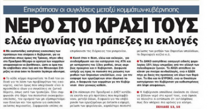 Η «Σημερινή», υπό τον τίτλο «Νερό στο κρασί τους ελέω αγωνίας για τράπεζες και εκλογές», γράφει ότι με εκατοντάδες εισηγήσεις ενισχυτικές των προτάσεων που ετοίμασε η Κυβέρνηση για να απαντήσεις στους όρους της Τρόικας, πήγαν χθες στο Προεδρικό οι αρχηγοί των κομμάτων, ώστε οι όροι που θα επιβληθούν στο λαό από τον Μηχανισμό Στήριξης να είναι όσον το δυνατό λιγότερο οδυνηροί. Αλλού γράφει, ότι η αντιπολίτευση αμφισβητεί την εξαγγελία της Κυβέρνησης και του απελθόντος αρμοδίου Υπουργού Σταύρου Μαλά, για το θέμα της μείωσης της τιμής των φαρμάκων και κάνει λόγο για «κάλπικη επιτυχία», αφού ενώ υπήρξαν εξαγγελίες για μειώσεις έως και 50% οι τιμές δεν φαίνεται να μειώνονται περισσότερο από 7% κατά μέσο όρο. Σε άλλο θέμα γράφει ότι μετά την πτώση του γερανού την περασμένη εβδομάδα στη Λάρνακα, αρκετές αντλίες μπετόν δεν έχουν ελεγχθεί ποτέ για την καταλληλότητά τους.