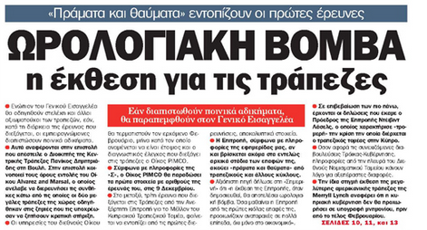 «Ωρολογιακή βόμβα η έκθεση για τις τράπεζες» είναι ο πρωτοσέλιδος τίτλος της «Σημερινής», η οποία γράφει ότι σύμφωνα με τους όρους εντολής του Οίκου Alvarez and Marsal, που κοινοποίησε ο Διοικητής της Κεντρικής στη Βουλή, στελέχη και άλλοι αξιωματούχοι των τραπεζών θα οδηγηθούν ενώπιον του Γενικού Εισαγγελέα, αν κατά τις έρευνες διαπιστωθούν ποινικά αδικήματα. Επίσης, γράφει ότι η νεολαία καταδίκασε το ψευδοκράτος, με αφορμή τη χθεσινή επέτειο της παράνομης ανακήρυξής του. Ακόμη γράφει ότι οι αλλοδαποί αύξησαν τον πληθυσμό της χώρας, σε 862 χιλ. στα τέλη του 2011, από 839,8 χιλ το 2010.