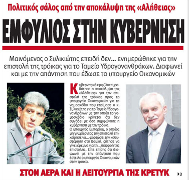 Η «Αλήθεια», στο κύριο της θέμα με τίτλο «Εμφύλιος στην Κυβέρνηση», γράφει πως κυβερνητικό εμφύλιο πυροδότησε η αποκάλυψη της εφημερίδας για την επιστολή της Τρόικας προς το Υπουργείο Οικονομικών για το νομοσχέδιο που ετοίμασε ο κ. Συλικιώτης για το Ταμείο Υδρογονανθράκων, με την οποία το νομοσχέδιο κρίνεται ότι δεν συνάδει με όσα συμφώνησε η κυβέρνηση με την Τρόικα. Αλλού σημειώνει πως σύμφωνα με το Διοικητή της ΚΤ οι ιδιωτικοποιήσεις περιλαμβάνονται στη συμφωνία με την Τρόικα και εξαρτώνται από τη βιωσιμότητα του χρέους. Αναφέρει ακόμα πως αφαιρείται η αύξηση στο ηλεκτρικό ρεύμα.