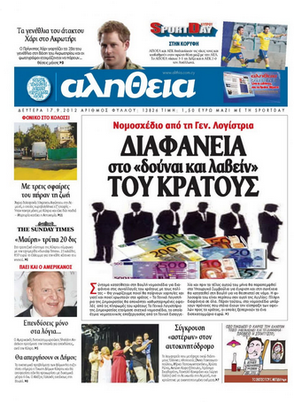 Η «Αλήθεια» υπό τον τίτλο «Διαφάνεια στο «δούναι και λαβείν» του κράτους» γράφει στο κύριο της θέμα πως σύντομα κατατίθεται στη Βουλή νομοσχέδιο για διαφάνεια στις συναλλαγές του κράτους με τους πολίτες, στο οποίο το Γενικό Λογιστήριο της Δημοκρατίας θα αποκόπτει καθυστερημένες οφειλές από τις πληρωμές του κράτους και έχει ως στόχο την είσπραξη οφειλών προς το κράτος που ξεπερνούν το ένα δισεκατομμύριο ευρώ. Αλλού η «Α» γράφει ότι ο Αμερικανός δισεκατομμυριούχος Sheldon Andelson προτίμησε την Ισπανία για επενδύσεις αντί την Κύπρο . Σε άλλο της θέμα η εφημερίδα γράφει ότι το λεωφορείο που μετέφερε οχτώ διάσημους Ελληνες ηθοποιούς από τη Λευκωσία στη Λεμεσό, συγκρούστηκε στον αυτοκινητόδρομο με ακινητοποιημένα οχήματα