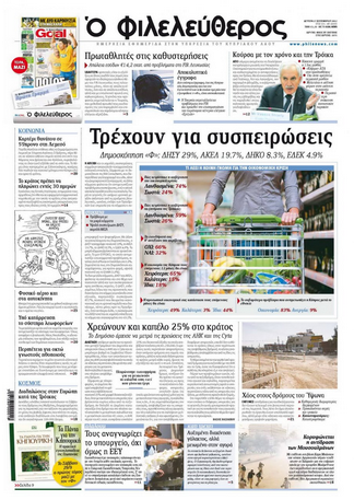«Ο Φιλελεύθερος» στεγάζει το κύριό του θέμα υπό τον τίτλο «Τρέχουν για συσπειρώσεις» και γράφει πως η αποχή και οι χαμηλές συσπειρώσεις κομμάτων, πλην του ΔΗΣΥ, απασχολούν τα κομματικά εκλογικά επιτελεία, σύμφωνα με τη δημοσκόπηση της RAI Consultants που διενεργήθηκε για λογαριασμό του «Φ». Σε άλλο του θέμα ο «Φ» γράφει ότι πληρώνουμε εκατομμύρια για την μετακίνηση καλωδίων από υπηρεσίες όπως η ΑΗΚ και η Cyta εκεί όπου γίνονται έργα για την αναβάθμιση δρόμων. Αλλού η εφημερίδα γράφει ότι ιδιαίτερα αρνητικές είναι οι εξελίξεις σε όλους σχεδόν τους τομείς που αφορούν το ιδιαίτερα ευαίσθητο θέμα του FIR Λευκωσίας τους τελευταίους μήνες, τόσο σε απώλεια κίνησης, όσο και σε απώλεια εσόδων αλλά και με ενοχλητική πρωτιά στις καθυστερήσεις.