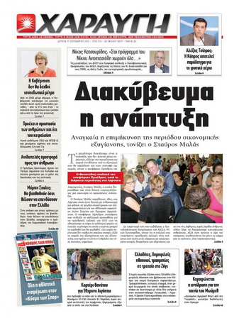 Η «Χαραυγή» υπό τον τίτλο «Διακύβευμα η ανάπτυξη» γράφει στο κύριο της θέμα ότι ο υποψήφιος Πρόεδρος της Δημοκρατίας Σταύρος Μαλάς, ανέφερε σε προεκλογική συγκέντρωση ότι το μεγαλύτερο διακύβευμα είναι η ανάπτυξης, που δεν έρχεται μέσω περικοπών, αλλά με την προσέλκυση και εισροή επενδύσεων από το εξωτερικό που θα συμβάλουν στην ανάνηψη της αγοράς. Αλλού αναφέρει ότι ο Πρόεδρος Χριστόφιας τίμησε τον πατέρα Αιμιλιανό στο Κελλάκι και έστειλε μηνύματα για το ρόλο της Εκκλησίας και της πολιτικής. Σε άλλο της θέμα η εφημερίδα γράφει από το 2008 μέχρι σήμερα η Κυβέρνηση κατάφερε να μειώσει σχεδόν κατά εφτά ποσοστιαίες μονάδες το ποσοστό των συνταξιούχων που ζούσαν κάτω από το όριο της φτώχειας, όπως ανέφερε Υπ. Εργασίας διαμηνύοντας ότι η Κυβέρνηση δεν θα δεχθεί ισοπεδωτικά μέτρα.
