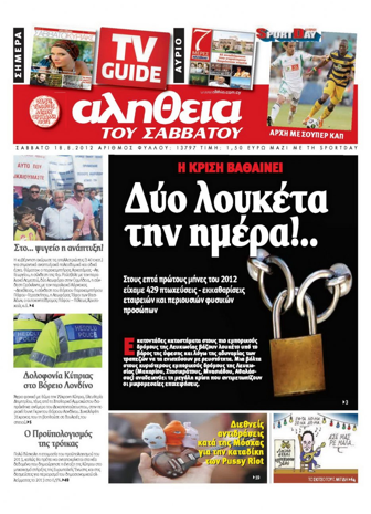 Η «Αλήθεια» έχει κύριο τίτλο «Δύο λουκέτα την ημέρα!..» και αναφέρεται στην κρίση γράφοντας ότι στους επτά πρώτους μήνες του 2012 είχαμε 429 πτωχεύσεις – εκκαθαρίσεις εταιρειών και περιουσιών φυσικών προσώπων. Σε άλλο θέμα γράφει ότι η ετοιμασία του προϋπολογισμού του 2013 είναι πολύ δύσκολη επειδή θα πρέπει να ανταποκρίνεται στα νέα δεδομένα του Μηχανισμού Στήριξης, ενώ αλλού αναφέρεται στη δολοφονία Κύπριας στο βόρειο Λονδίνο ανήμερα του Δεκαπενταύγουστου.