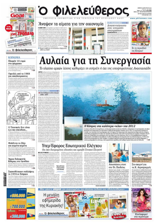 «Ο Φιλελεύθερος» με κύριο τίτλο «Αυλαία για τη συνεργασία» αναφέρεται στη σημερινή συνάντηση ΔΗΣΥ – ΔΗΚΟ και γράφει ότι το πλαίσιο αρχών λύσης καθορίζει τη στήριξη ή όχι της υποψηφιότητας Αναστασιάδη. Σε άλλο θέμα γράφει ότι Δεκαπενταύγουστο πήγαν στην «επιτροπή αποζημιώσεων» Ελληνοκύπριοι για να καταθέσουν αιτήσεις διεκδίκησης των περιουσιών τους. Αλλού αναφέρεται σε νομοσχέδιο που προωθείται στη Βουλή για υπερ-έφορο εσωτερικού ελέγχου που θα έχει διευρυμένες εξουσίες και αμοιβή Γενικού Ελεγκτή.