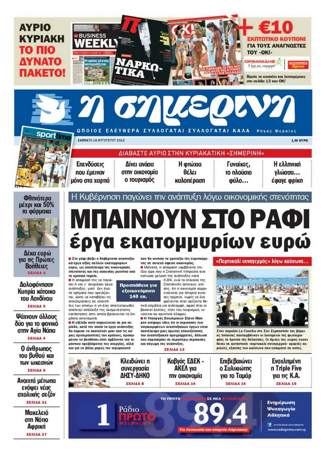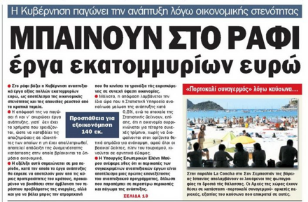 «Η Σημερινή» γράφει στο κύριο της θέμα ότι η κυβέρνηση παγώνει την ανάπτυξη λόγων οικονομικής στενότητας και με τίτλο «Μπαίνουν στο ράφι έργα εκατομμυρίων ευρώ» αναφέρει πως με το πάγωμα ή την ακύρωση των έργων αυτών γίνετια προσπάθεια να εξοικονομηθούν 140 εκ ευρώ. Αλλού γράφει πως ψάχνουν άλλους δυο για το πενταπλό φονικό στην Αγία Νάπα, ενώ σε άλλο θέμα γράφει ότι η Triple Five είναι ενοχλημένη για το θέμα των ΚΑ καθώς αναμένει εδώ και 10 ημέρες τα ονόματα του νέου ΔΣ της εταιρείας.