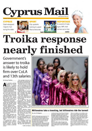 Η αγγλόγλωσση «Cyprus Mail» στεγάζει το πρωτοσέλιδό της υπό τον τίτλο «Η απάντηση της Τρόικας έχει σχεδόν ολοκληρωθεί» και γράφει ότι σύμφωνα με τα όσα δήλωσε χθες ο Κυβερνητικός Εκπρόσωπος, μετά το πέρας της συνεδρίας του Υπουργικού Συμβουλίου με θέμα τον κρατικό προϋπολογισμό του 2013, το πακέτο μέτρων λιτότητας που ετοιμάστηκε από την Κυβέρνηση ως απάντηση στα μέτρα που πρότεινε η Τρόικα είναι σχεδόν έτοιμο. Η εφημερίδα αναφέρεται, επίσης, στην πρώτη της σελίδα στην απόφαση της Ένωσης Δήμων Κύπρου να λάβει νομικά μέτρα κατά της κυβέρνησης για την απόφασή της να αποκόψει χορηγία προς τους Δήμους. Η εφημερίδα φιλοξενεί, επίσης, εκτενές αφιέρωμα στη Γενική Διευθύντρια του Διεθνούς Νομισματικού Ταμείου Κριστίν Λαγκάρντ.