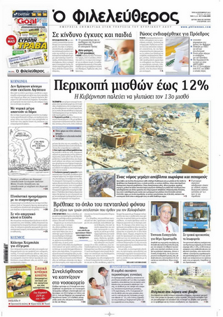 «Περικοπή μισθών έως 12%» είναι ο τίτλος του κύριου θέματος του «Φιλελευθέρου» που γράφει ότι τα σενάρια των μέτρων επιχειρεί να περάσει στον προϋπολογισμό του 2013 από χθες η Κυβέρνηση, ενώ οι επόμενες ημέρες θα καθορίσουν τις τελικές προτάσεις με τις οποίες θα προσπαθήσει η χώρα να διαπραγματευτεί με την Τρόικα. Σε άλλο θέμα από την πρώτη σελίδα, η εφημερίδα γράφει ότι έγκυες και τα έμβρυα τους, νεογνά καθώς και παιδιά που νοσηλεύονται στο Νοσοκομείο Λεμεσού βρίσκονται καθημερινά σε κίνδυνο και αυτό επειδή δύο εξωτερικά ιατρεία καλούνται να εξυπηρετήσουν 150 και πλέον γυναίκες. Αλλού, γράφει ότι Ρώσος επιχειρηματίας έχει επιδείξει ενδιαφέρον για τις προεδρικές εκλογές, ζητώντας να ενημερωθεί.