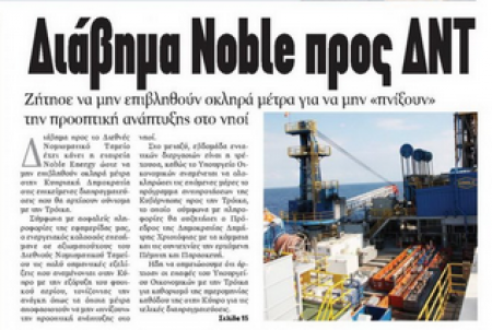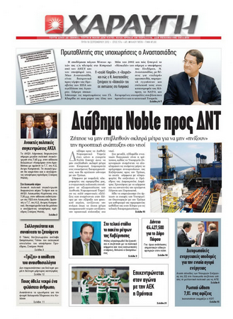 Η «Χαραυγή» στεγάζει το πρωτοσέλιδό της υπό τον τίτλο «Διάβημα Noble προς ΔΝΤ» και γράφει ότι διάβημα προς το ΔΝΤ έχει κάνει η εταιρεία Noble Energy, ώστε να μην επιβληθούν σκληρά μέτρα στην Κυπριακή Δημοκρατία στις επικείμενες διαπραγματεύσεις που θα αρχίσουν σύντομα με την Τρόικα. Γράφει, επίσης, ότι η αποδόμηση πάγιων θέσεων αρχών της ε/κ πλευράς στο Κυπριακό από το ΔΗΣΥ και τον υποψήφιο του είναι διαχρονική προς τέρψιν της Πρεσβείας των ΗΠΑ και αγαλλίαση της Άγκυρας. Αλλού, γράφει ότι στο τελικό στάδιο βρίσκεται η ετοιμασία του πακέτου μέτρων που ετοιμάζει η Κυβέρνηση για δημοσιονομική εξυγίανση, δήλωσε χθες ο Κυβερνητικός Εκπρόσωπος, συμπληρώνοντας ότι μόλις ολοκληρωθεί θα ξεκινήσει η συζήτηση με τα πολιτικά κόμματα και τους κοινωνικούς εταίρους.