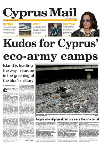 Η αγγλόγλωσση εφημερίδα “Cyprus Mail” στο κύριο της θέμα με τίτλο «Εύσημα για την Κύπρο για τα οικολογικά στρατόπεδα», γράφει ότι η Κύπρος πήρε τους επαίνους για τα φιλικά προς το περιβάλλον στρατόπεδα της, από ένα ευρύ φάσμα Ευρωπαϊκών ενημερωτικών δελτίων για την διπλωματία και την άμυνα. Σε άλλο της θέμα η εφημερίδα γράφει για το περιστατικό με την 7χρονη που κινδυνεύει να χάσει την όρασή της μετά από λάθος οδοντίατρου στο Γενικό Νοσοκομείο Πάφου, και τη δήλωση του πατέρα της ότι στο νοσοκομείο συμπεριφέρθηκαν στο παιδί ως ένα άψυχο αντικείμενο. Αλλού, γράφει για τα ευρήματα έρευνας ότι οι άνθρωποι που δεν τρώνε πρωινό έχουν περισσότερες πιθανότητες να γίνουν υπέρβαροι.
