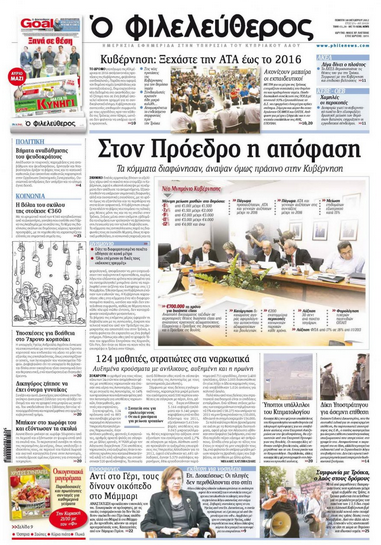 Ο «Φιλελεύθερος», υπό τον τίτλο «Στον Πρόεδρο η απόφαση», γράφει ότι η χθεσινή σύσκεψη των κομμάτων για συμφωνία σε πακέτο αντιπροτάσεων στην Τρόικα, δεν απέδωσε τα αναμενόμενα, καθώς εξακολουθούν να υπάρχουν σημαντικές διαφωνίες αλλά και ουσιαστικές συγκλίσεις. Η Κυβέρνηση, γράφει η εφημερίδα, επωμίζεται πλέον το βάρος να ετοιμάσει τις τελικές μας θέσεις μόνη της και να τις στείλει στην Τρόικα. Σε άλλο θέμα, γράφει ότι οι συνδικαλιστές φοβούνται ότι το δρόμο παγώματος της ΑΤΑ μέχρι το 2016 ανοίγουν οι νέες προτάσεις της Κυβέρνησης. Αλλού, γράφει ότι 124 πρόσωπα ή το 14% αυτών που συνέλαβε η Αστυνομία για υποθέσεις ναρκωτικών, ήταν μαθητές, φοιτητές και στρατιώτες.