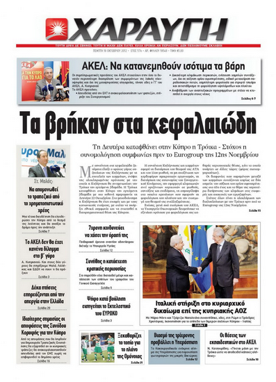 Η «Χαραυγή», στο κύριο της θέμα με τίτλο «Τα βρήκαν στα κεφαλαιώδη», γράφει ότι με συναίνεση στα κεφαλαιώδη ζητήματα έληξε ο πρώτος γύρος συζητήσεων της Κυβέρνησης με τα επιτελεία των κομμάτων για συνομολόγηση της ολοκληρωμένης πρότασης, με την οποία η Κυβέρνηση θα αντιμετωπίσει την Τρόικα την ερχόμενη βδομάδα. Η πιο πιθανή ημερομηνία καθόδου της Τρόικας, σύμφωνα με την εφημερίδα, είναι η Δευτέρα, 22 Οκτωβρίου. Αλλού, γράφει για ιταλική στήριξη στο κυριαρχικό δικαίωμα επί της κυπριακής ΑΟΖ, όπως εκφράστηκε κατά τις χθεσινές συναντήσεις στη Ρώμη του Προέδρου Χριστόφια με Μάριο Μόντι και Τζόρτζιο Ναπολιτάνο. Σε άλλο θέμα, γράφει για τη θέση που εξέφρασε ο υποψήφιος Πρόεδρος Σταύρος Μαλάς ότι θα πρέπει να απομονωθεί το τραπεζικό από το χρηματοπιστωτικό χρέος για να ανοίξει ο δρόμος της ανάπτυξης.