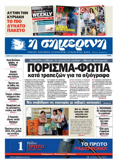 Η «Σημερινή», στο κύριο της θέμα με τίτλο «Πόρισμα-Φωτιά κατά τραπεζών για τα αξιόγραφα», γράφει ότι το πόρισμα της Κεντρικής Τράπεζας καταλογίζει βαρύτατες ευθύνες στην Τράπεζα Κύπρου και στη Λαϊκή, ενώ «φωτογραφίζει» συγκεκριμένα στελέχη των δύο τραπεζών ως ηθικούς αυτουργούς. Αλλού, κάτω από τον τίτλο «Από τη ‘δίκαιη κοινωνία’ στην κοινωνία των απελπισμένων», γράφει για συγκλονιστικές σκηνές που εκτυλίσσονται κάθε Τετάρτη στα γραφεία της Επαρχιακής Επιτροπής Πολυτέκνων Λευκωσίας, όπου διανέμεται γάλα και άλλα είδη σε απελπισμένες οικογένειες. Σε άλλο της θέμα, γράφει ότι το Εκτελεστικό Γραφείο του ΕΥΡΩΚΟ αποφάσισε να εισηγηθεί στο Κεντρικό Συμβούλιο την επιλογή της κατά βούληση ψήφου στις προεδρικές.
