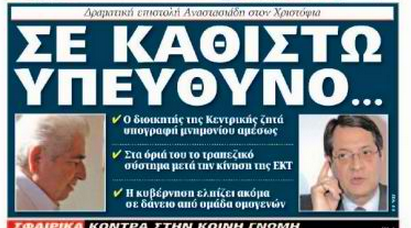 «Η Καθημερινή της Κυριακής» υπό τον τίτλο «Τελευταία παρτίδα Χριστόφια σε σκληρό πόκερ» γράφει ότι με την πλάτη στον τοίχο βρίσκεται η Κυβέρνηση στις διαπραγματεύσεις με την Τρόικα, καθώς το οικονομικό κλίμα επιδεινώνεται μέρα με τη μέρα και τα αποθεματικά του κράτους εξαντλούνται. Αλλού προβάλλει συνέντευξη του υποψηφίου για την Προεδρία Νίκου Αναστασιάδη, ο οποίος όπως αναφέρεται, εμφανίζεται έτοιμος και με λύσεις στο χέρι για γρήγορη έξοδο από την κρίση και μιλά για τους κινδύνους που ελλοχεύουν ενόσω δεν υπάρχει κατάληξη με την Τρόικα. Αλλού γράφει ότι σε ένα από τα τρία σημεία-κλειδιά για όλη την ΕΕ αναδεικνύεται η Κύπρος μέσω του συστήματος MEOLUT, το οποίο θα παρέχει πληροφορίες σε όλα τα κράτη-μέλη της ΕΕ για θέματα Έρευνας και Διάσωσης.